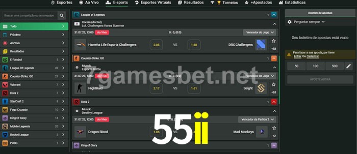 O 55ii oferece uma grande seleção de opções de apostas em e-sports com probabilidades competitivas